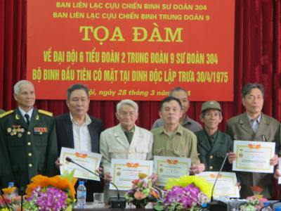 QĐND Online - Sáng 28-3, tại Hà Nội, Ban liên lạc Cựu chiến binh Trung đoàn 9, Sư đoàn 304 tổ chức Tọa đàm về thành tích chiến đấu đặc biệt xuất sắc của Đại đội bộ binh 6, Tiểu đoàn 2, Trung đoàn 9 trong chiến dịch Huế-Đà Nẵng, chiến dịch Hồ Chí Minh lịch sử (30-4-1975) “Đơn vị bộ binh đầu tiên cùng xe tăng 843, 390 đánh chiếm Dinh Độc Lập, bắt tù binh, thu vũ khí”.