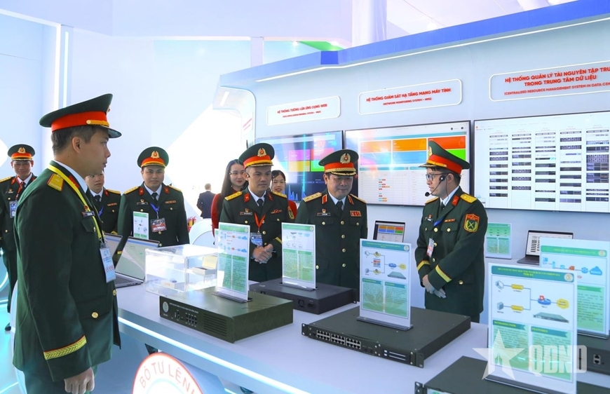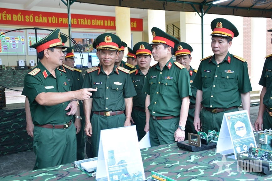 | Lãnh đạo Bộ Quốc phòng kiểm tra kết quả công tác phát triển khoa học-công nghệ, đổi mới sáng tạo và chuyển đổi số tại Binh chủng Thông tin liên lạc, tháng 7-2025. Ảnh: VĂN HIẾU |