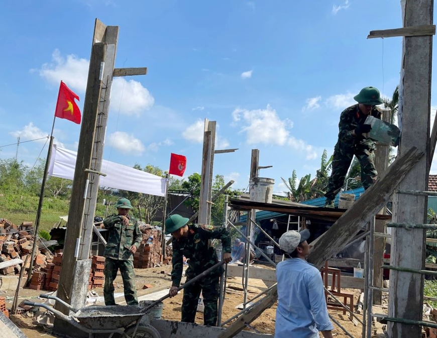 | Cán bộ, chiến sĩ Quân đoàn 34 tham gia xây dựng nhà sau lũ cho người dân ở miền Trung. Ảnh: CHUNG NGUYỄN |