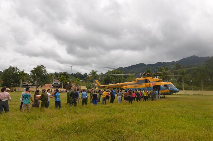 | Trực thăng Trung đoàn 916, Sư đoàn 371, Quân chủng Phòng không-Không quân vận chuyển nhu yếu phẩm cho người dân vùng lũ Điện Biên, tháng 8-2025. Ảnh: CHÍ PHAN |