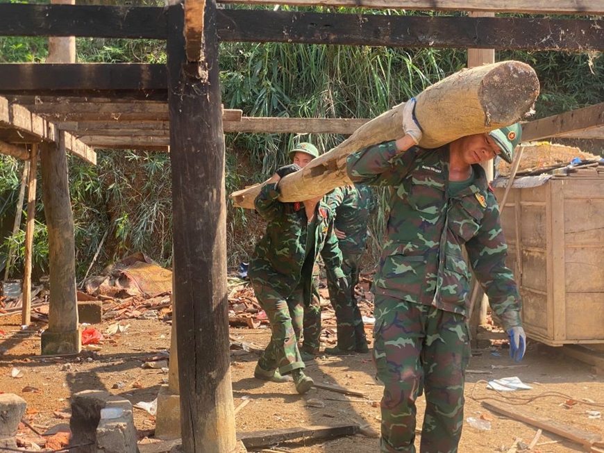| Cán bộ, chiến sĩ Sư đoàn 316 (Quân khu 2) giúp đồng bào Sơn La xây dựng lại nhà sau trận lũ lịch sử cuối tháng 7, đầu tháng 8-2025. Ảnh: VĨNH PHÚC |