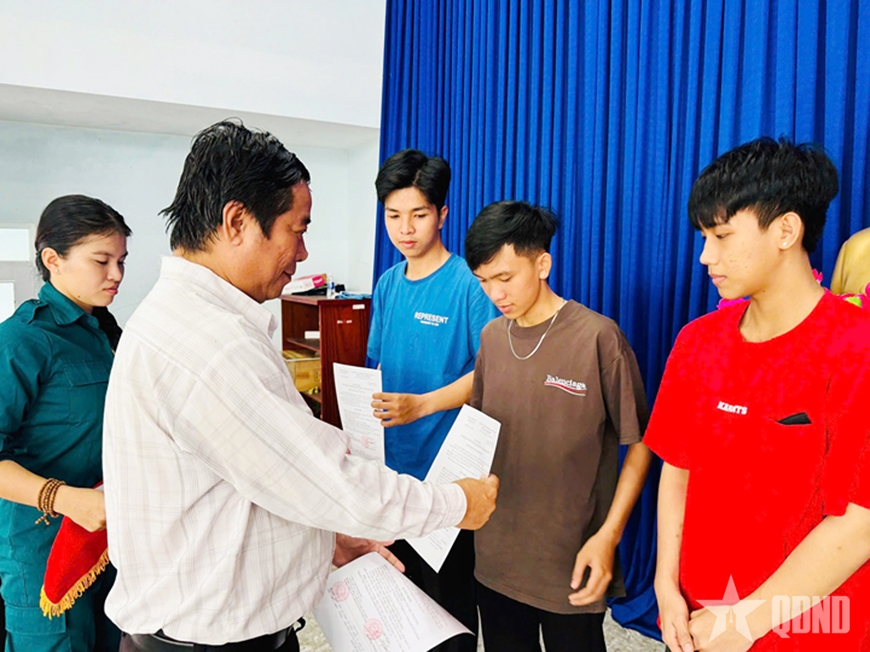 | Lãnh đạo xã đảo Thạnh An trao quyết định khám tuyển nghĩa vụ quân sự năm 2026 cho thanh niên. |