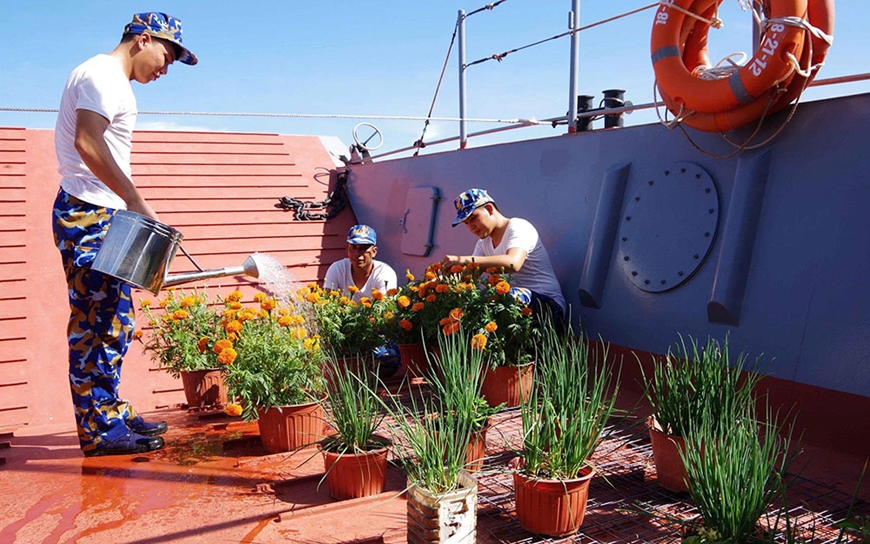 | Cán bộ, chiến sĩ Biên đội tàu, Đại đội 4, Tiểu đoàn 2, Lữ đoàn 962 (Quân khu 9) chăm sóc hoa cảnh chuẩn bị đón Tết Nguyên đán. |