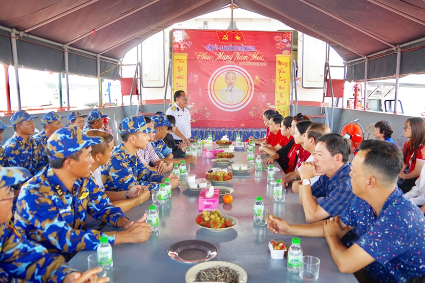 | Đại tá Lê Thanh Nhã, Chính ủy Lữ đoàn 962 thăm, chúc Tết cán bộ, chiến sĩ Biên đội tàu thực hiện nhiệm vụ trên tuyến biên giới. |