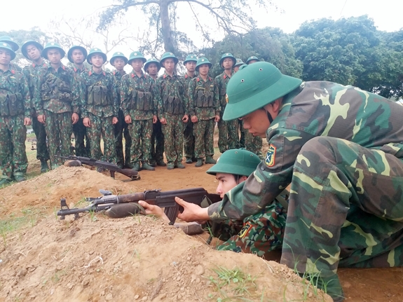 Cán bộ đại đội trực tiếp sửa sai cho chiến sĩ mới trong luyện tập bắn súng AK bài 1 tại Trung đoàn 50. |