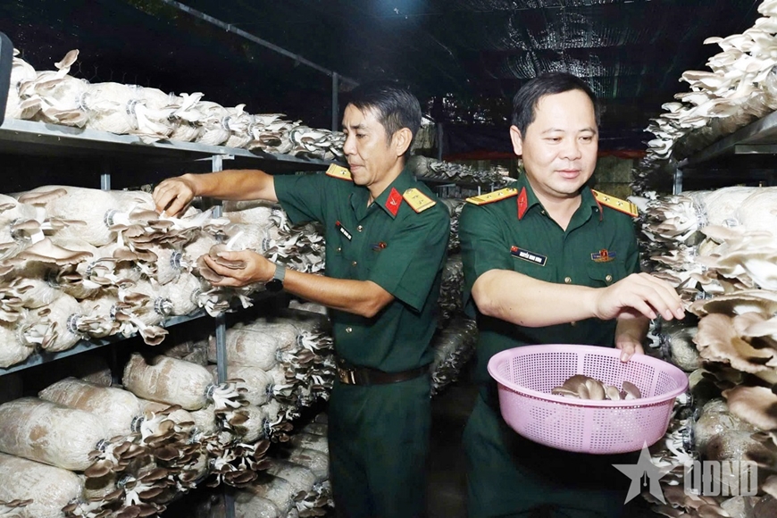 | Thu hoạch nấm bào ngư ở Ban chỉ huy Phòng thủ khu vực 2 - Phú Lợi. |
