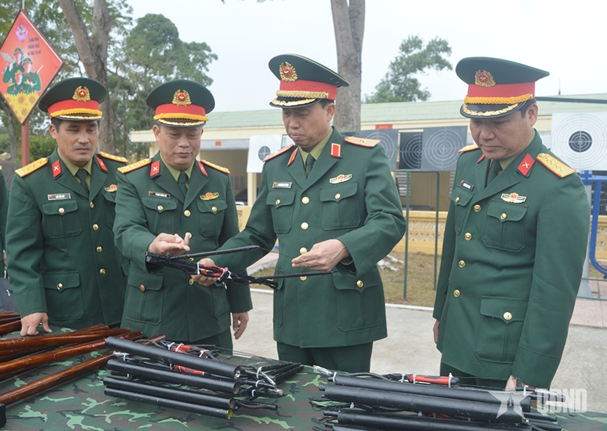 | Chỉ huy Trung đoàn 2 kiểm tra hiệu quả của sáng kiến, cải tiến kỹ thuật trong đơn vị. |