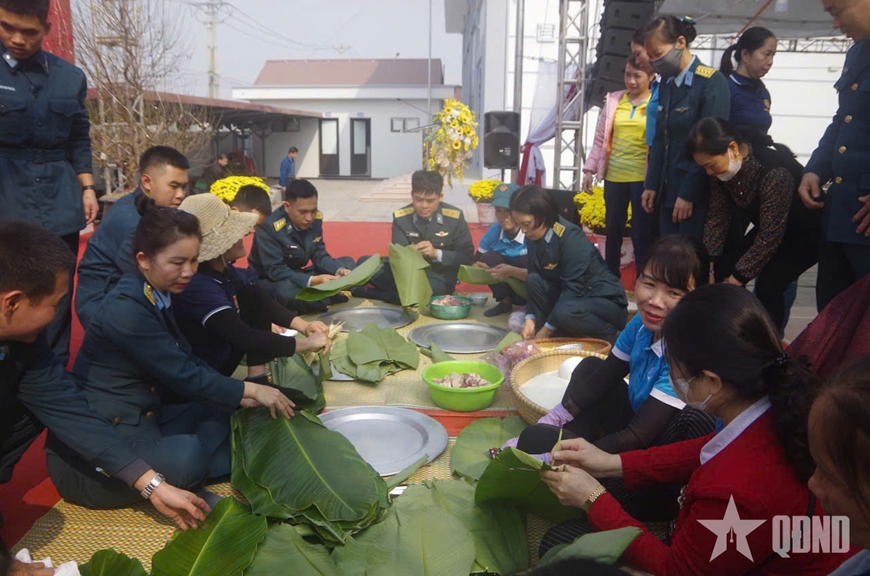 Cán bộ, chiến sĩ Trung đoàn 236 và hội viên Hội Phụ nữ xã Dục Tú thi gói bánh.