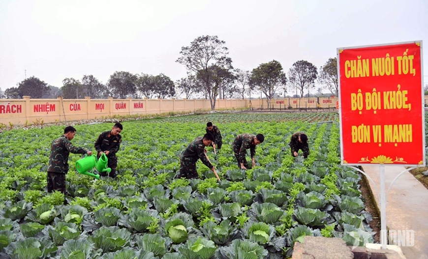 Ở khu tăng gia sản xuất, những luống bắp cải, súp lơ, rau cải xanh tốt góp phần bảo đảm nguồn thực phẩm sạch cho bộ đội trong dịp Tết. Đồng chí Vi Văn Tâm, chiến sĩ Đại đội 9, chia sẻ: “Tết là dịp sum họp, nhất là với tôi khi vừa lập gia đình. Nhưng xác định nhiệm vụ bảo vệ Tổ quốc là trên hết, tôi cùng đồng đội quyết tâm hoàn thành tốt nhiệm vụ trực Tết, để nhân dân được đón Xuân an vui”.