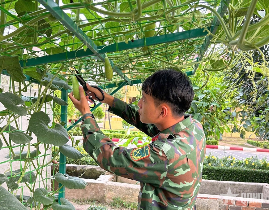 | Vườn tăng gia của đơn vị luôn sẵn sàng các loại rau, quả phục vụ bữa ăn bộ đội. |