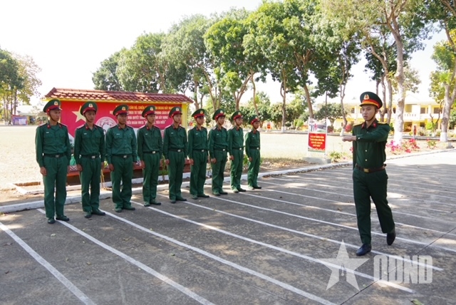| Trung đoàn 584 bồi dưỡng điều lệnh đội ngũ cho cán bộ khung. |