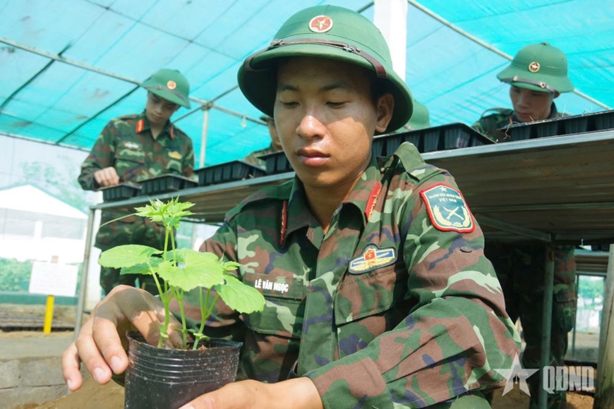 Thời tiết đang trong giai đoạn chuyển mùa, khu vườn tăng gia của đơn vị khá ẩm ướt, nhưng sau những giờ phút vất vả trên thao trường, Trung sĩ Lê Văn Ngọc, Tiểu đội trưởng Tiểu đội 1, Trung đội 1, Đại đội 4, Tiểu đoàn 2, Trung đoàn 841 vẫn miệt mài, vui vẻ cùng đồng đội bên vườn ươm giống mới của đơn vị.