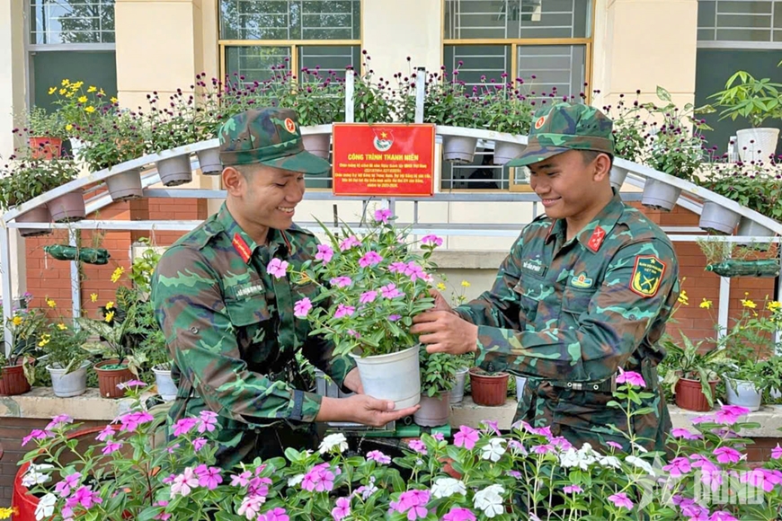 Năm nay, phong trào trồng, chăm sóc và trang trí hoa trong khuôn viên đơn vị được Trung đoàn đặc biệt quan tâm và phát động sâu rộng, góp phần tạo diện mạo mới khang trang, cảnh quan đơn vị sáng - xanh - sạch - đẹp. Các tuyến đường nội bộ đơn vị được chỉnh trang với hoa mười giờ, dạ yến thảo, cúc vàng, hướng dương... rực rỡ, đua nhau khoe sắc. Những bàn tay vốn quen với thao trường, bãi tập trở nên tỉ mỉ khi vun trồng từng luống hoa, cũng như tưới nước, cắt tỉa, chăm sóc.