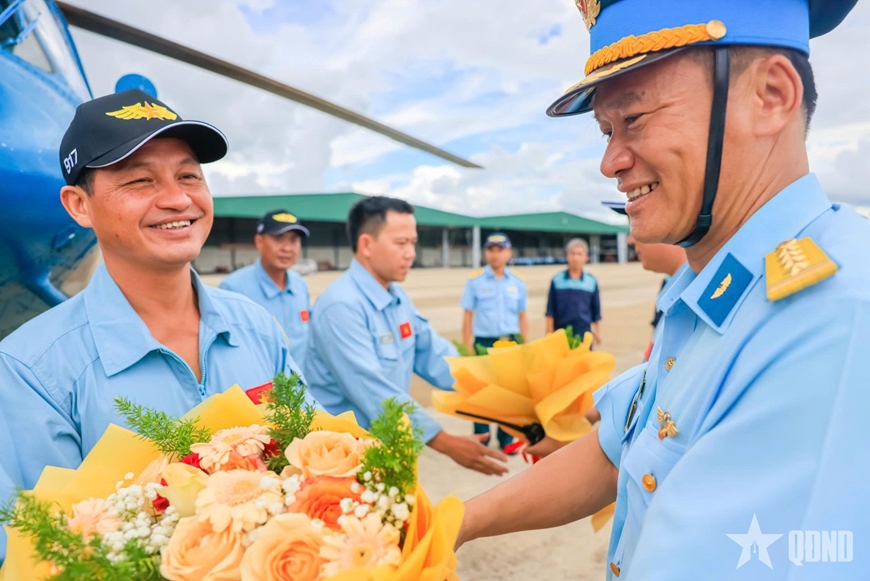 Đại tá Ngô Hồng Sơn tặng hoa phi công và thành viên tổ bay hoàn thành nhiệm vụ. |