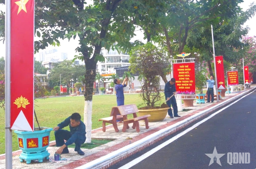 Cán bộ, chiến sĩ Đại đội 10 Thông tin (Trung đoàn Pháo phòng không 224) củng cố bồn hoa, cây cảnh.