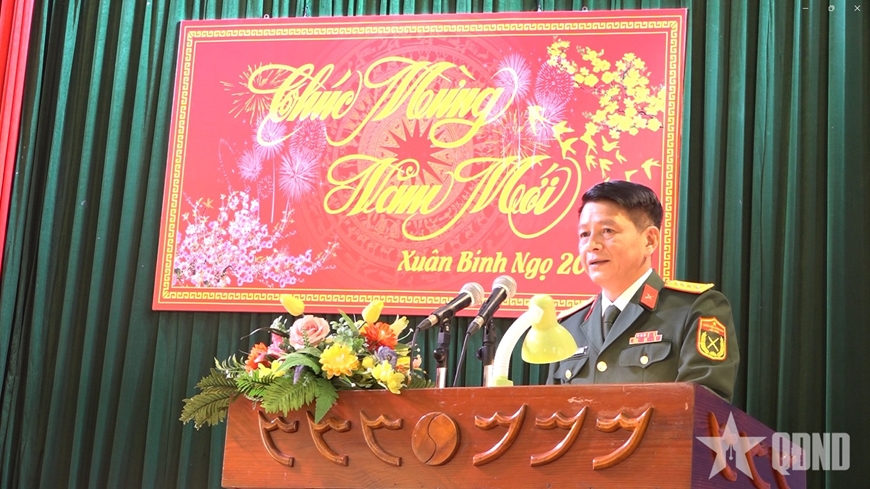 | Đại tá Trịnh Quang Tùng, Hiệu trưởng Trường Quân sự Quân đoàn 12 chúc Tết cán bộ, nhân viên, học viên, chiến sĩ nhân dịp đầu xuân mới. |