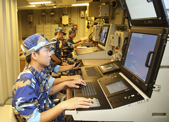 Giờ huấn luyện ở Trung tâm chỉ huy chiến đấu Tàu 016, Lữ đoàn 162, Vùng 4 Hải quân. |