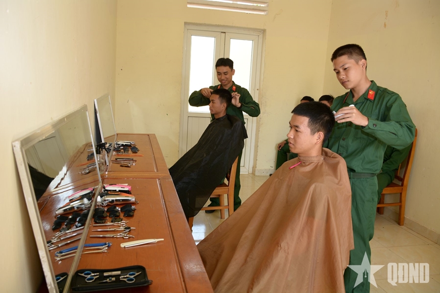 | "Chăn vuông góc, tóc ba phân", các chiến sĩ giúp nhau làm đẹp sau giờ huấn luyện. |
