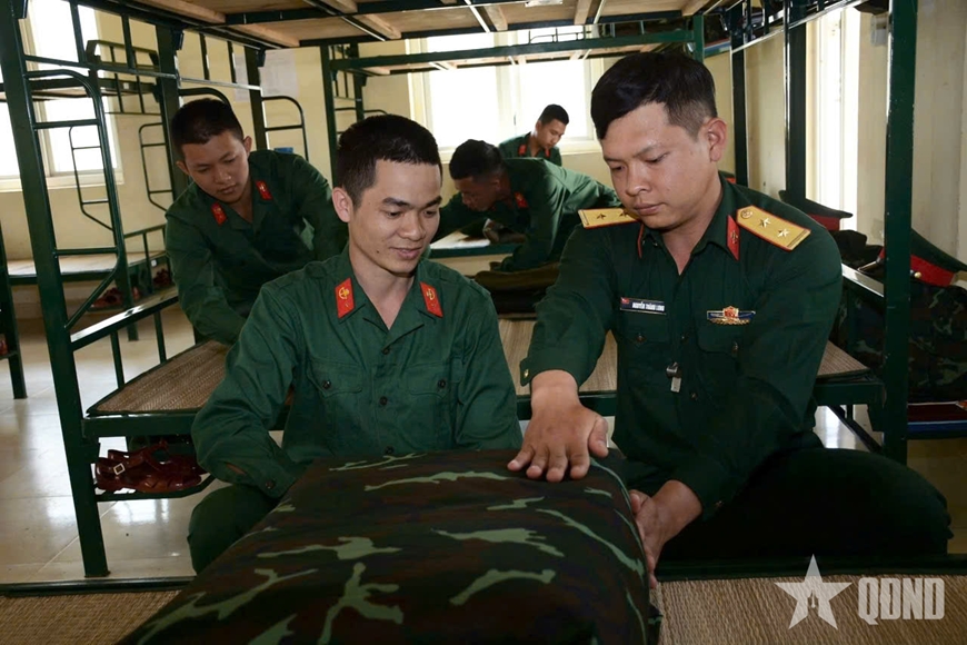| Trung đội trưởng hướng dẫn bộ đội cách gấp chăn vuông. |