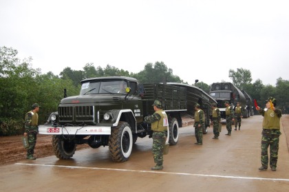 Xe máy, khí tài của Đoàn H49 (Binh chủng Công binh) phục vụ huấn luyện nội dung "Phân đội công binh hạ thủy, lắp ghép, chèo chở phà PMP". Ảnh: Phạm Quân.
