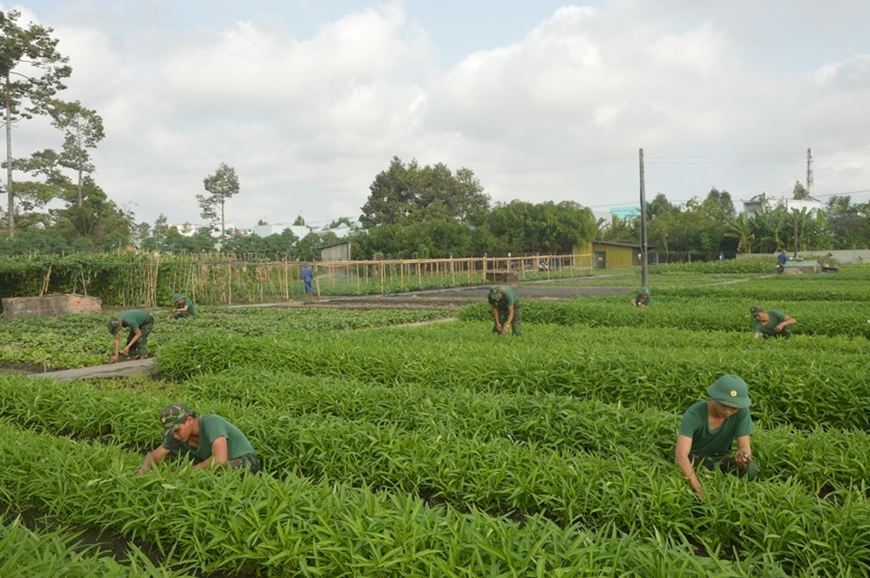 | Bộ đội Lữ đoàn Thông tin 29 chăm sóc vườn rau xanh tập trung của đơn vị. |