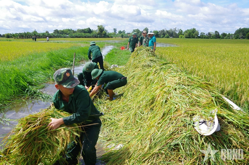 | Cán bộ, chiến sĩ Ban Chỉ huy Bộ đội Biên phòng tỉnh Tây Ninh phối hợp giúp dân gặt lúa. |
