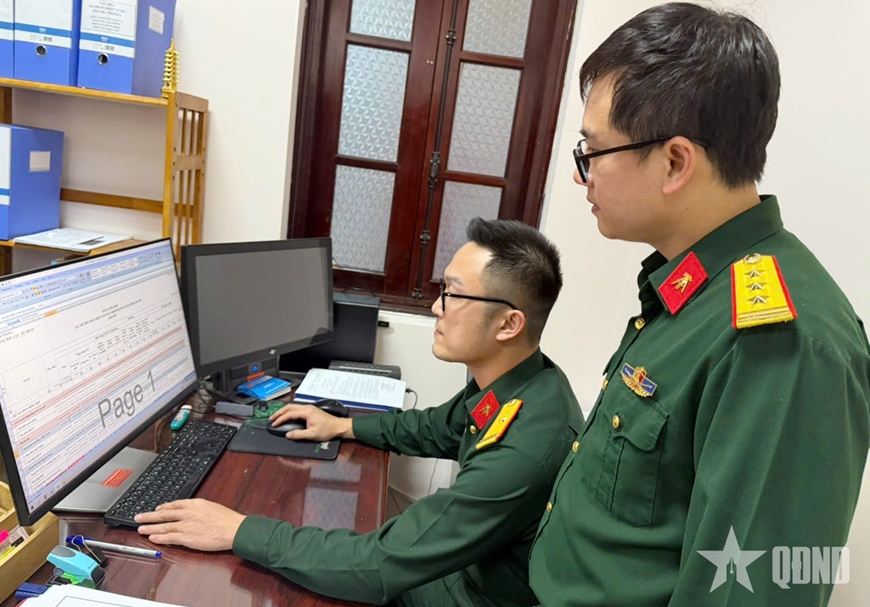 Thiếu tá Lê Nhật Tân (người ngồi) trao đổi cùng đồng nghiệp về ứng dụng sáng kiến của mình trong quản lý tài sản, đánh giá rủi ro tài chính.