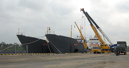 | Chỉ huy Lữ đoàn 649 giám sát việc xếp đặt vật chất trang bị kỹ thuật, làm công tác chuẩn bị để tàu rời bến |