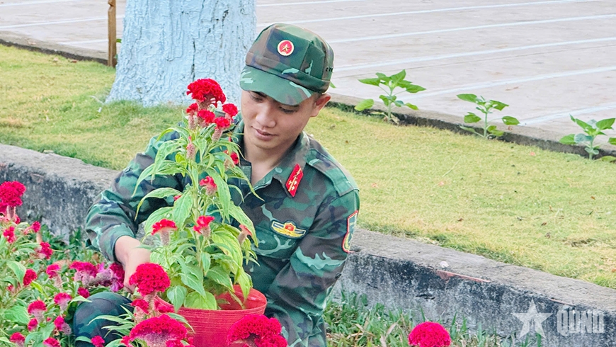 Tại Trung đoàn 20, Sư đoàn 330, Quân khu 9, sau những giờ huấn luyện căng thẳng, các cán bộ, chiến sĩ lại trở về với một công việc rất đỗi đời thường: Vun xới đất, tưới nước, tỉa lá cho từng chậu hoa. Những bàn tay từng chắc tay súng, quen với thao tác điều lệnh, nay trở nên nhẹ nhàng, tỉ mỉ, kiên nhẫn chăm chút cho từng mầm xanh. Mỗi chậu hoa không chỉ là thành quả của sự khéo léo, mà còn chứa đựng tình yêu đơn vị, ý thức xây dựng doanh trại chính quy, xanh, sạch, đẹp.