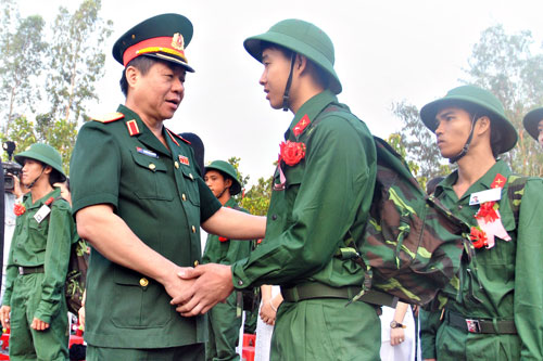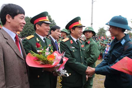 Trung tướng Mai Quang Phấn, Ủy viên Trung ương Đảng, Phó chủ nhiệm Tổng cục Chính trị, động viên thanh niên huyện Nông Cống trước lúc lên đường.