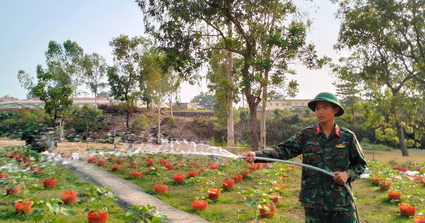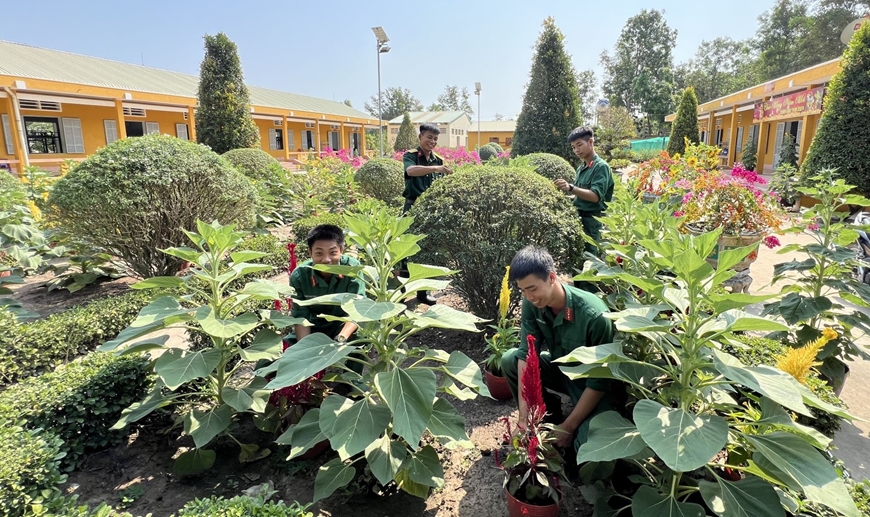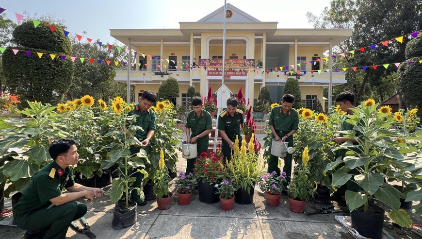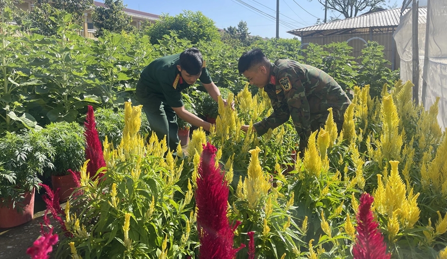| Cán bộ, chiến sĩ chăm sóc vườn hoa, khuôn viên đơn vị đón Tết tại Tiểu đoàn bộ Tiểu đoàn 8, Trung đoàn 3, Sư đoàn 9, Quân đoàn 4. |