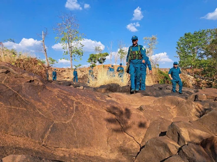 | Các chiến sĩ "sao vuông" tại chốt chiến đấu dân quân thường trực xã Ia Nan (Đức Cơ, Gia Lai) làm nhiệm vụ tuần tra. |