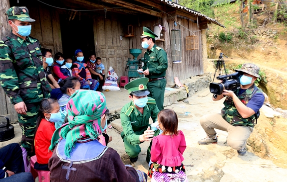 | Phóng viên Kênh Truyền hình QPVN đưa tin BĐBP tuyên truyền phòng, chống đại dịch Covid-19. Ảnh: PHAN GIANG |