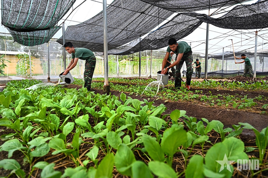 Mỗi người một việc bảo đảm cho khu tăng gia của đơn vị luôn có rau, củ, quả gối vụ, không để đất trống hoặc rau xanh quá lứa. Đại úy Đào Trọng Tiềm, Phó tiểu đoàn trưởng Tiểu đoàn 7 chia sẻ: “Do đặc điểm thổ nhưỡng chủ yếu là đất sét, đất nhiễm phèn, mùa khô thì đất cứng như đá, mùa mưa nước đọng thành nhiều vũng sình lầy nên để chăm sóc vườn rau, chúng tôi cho bộ đội cắt cỏ, dọn rác, lấy bèo tây ủ mục để cải tạo đất; trộn đất màu mỡ lên trên và xử lý mầm bệnh đúng cách trước khi trồng cây giống. Quá trình chăm sóc, tưới tiêu được thực hiện theo đúng hướng dẫn của Phòng Hậu cần-Kỹ thuật để vườn, giàn luôn xanh tốt, cho năng suất cao”.