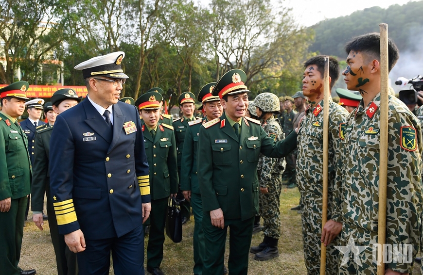 | Đại tướng Phan Văn Giang, Ủy viên Bộ Chính trị, Phó bí thư Quân ủy Trung ương, Bộ trưởng Bộ Quốc phòng Việt Nam và Thượng tướng Đổng Quân, Bộ trưởng Bộ Quốc phòng Trung Quốc động viên bộ đội trong chuyến thăm Lữ đoàn Đặc công bộ 113 (Binh chủng Đặc công). Ảnh: TUẤN HUY |