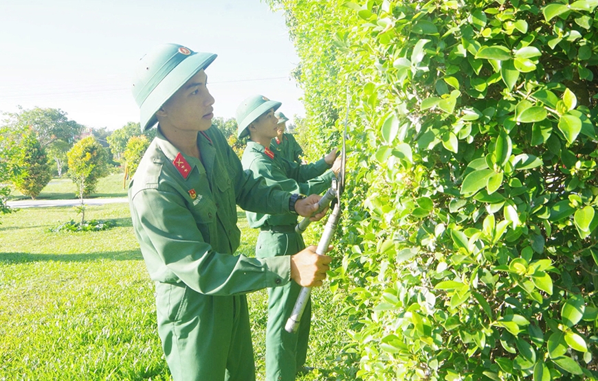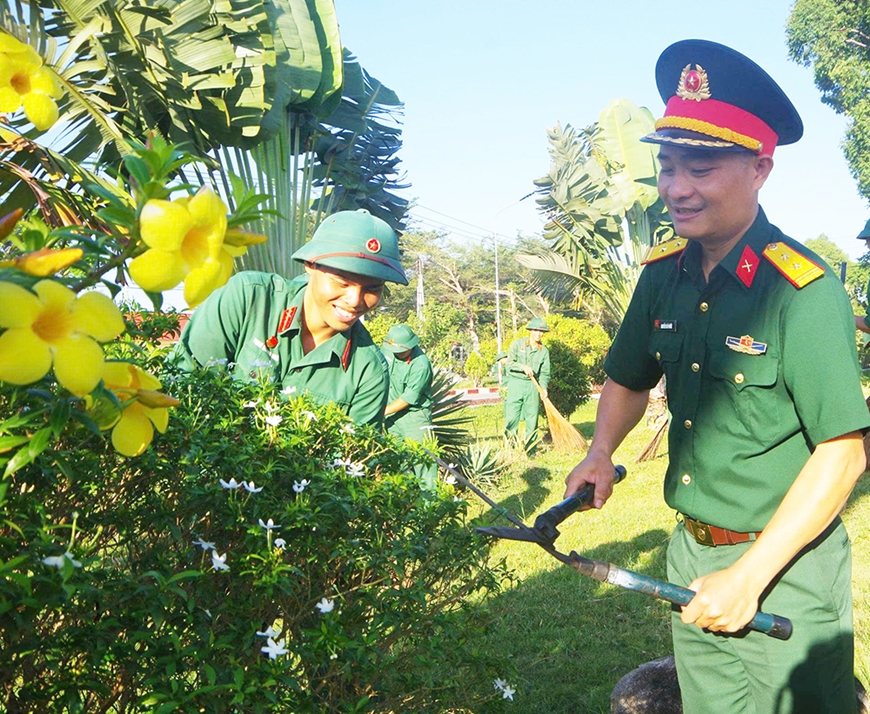 Sáng sớm, có mặt tại Đại đội 10, Tiểu đoàn 6 (Trung đoàn 5), chúng tôi chứng kiến sau khi tập thể dục sáng, tất cả cán bộ, chiến sĩ đều tự giác dọn vệ sinh, cắt tỉa cây xanh hay trồng thêm hoa tại các luống, chăm sóc tỉ mỉ những hàng cây cảnh quanh khuôn viên. Đến buổi chiều sau giờ huấn luyện, tại các phân đội, không khí càng rộn ràng, sôi nổi hơn với những lớp hướng dẫn kỹ thuật trồng bonsai, ươm giống hoa, kỹ thuật chăm sóc cây ăn trái... Những bàn tay chiến sĩ cầm súng giờ tỉ mẩn cắt, uốn, ghép cây cảnh thành tác phẩm nghệ thuật.