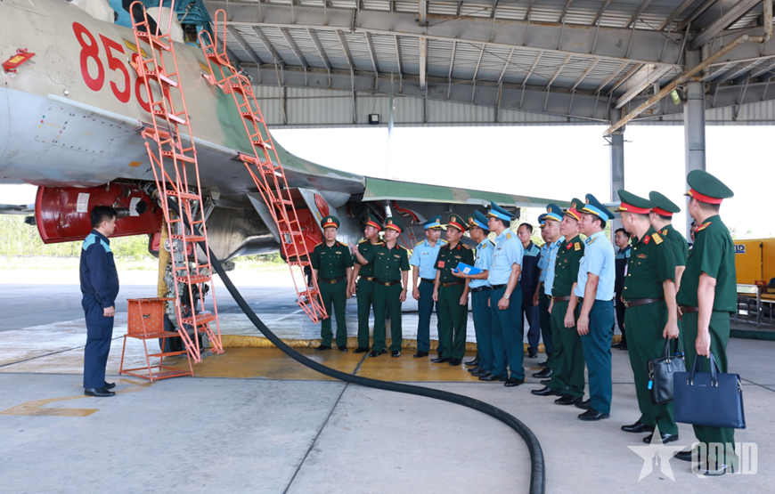 | Đoàn công tác Cục Xăng dầu và Quân chủng Phòng không - Không quân kiểm tra, tra nạp nhiên liệu cho máy bay tại Trung đoàn 927, Sư đoàn 371. Ảnh: LÊ NAM |