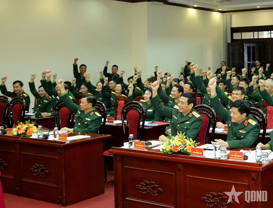 Đại tướng Phan Văn Giang, Ủy viên Bộ Chính trị, Phó bí thư Quân ủy Trung ương, Bộ trưởng Bộ Quốc phòng dự hội nghị cùng cán bộ, nhân viên Văn phòng Bộ Quốc phòng, tháng 1-2026. Ảnh: VĂN HIẾU