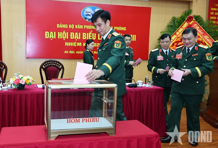 | Đại hội đại biểu Đảng bộ Văn phòng Bộ Quốc phòng lần thứ XXIII tiến hành bỏ phiếu bầu Ban Chấp hành Đảng bộ nhiệm kỳ 2025-2030. Ảnh: VĂN CHIỂN |