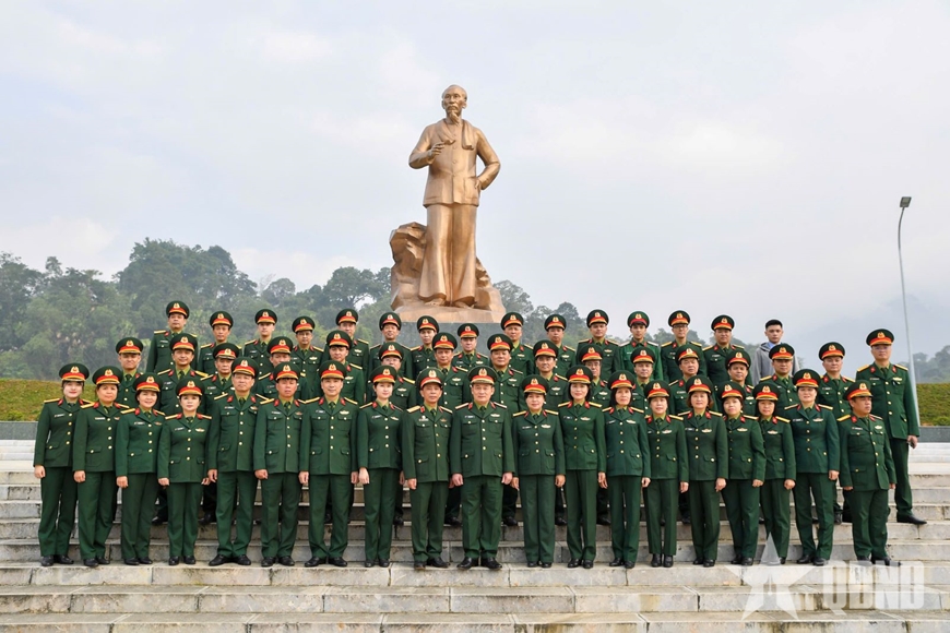 | Đoàn công tác Văn phòng Bộ Quốc phòng bên tượng đài Bác Hồ ở Khu di tích quốc gia đặc biệt Tân Trào, tỉnh Tuyên Quang, tháng 12-2025. Ảnh: VŨ TÚ |