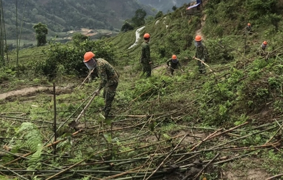 Cán bộ, chiến sĩ Lữ đoàn Công binh 543 (Quân khu 2) rà phá vật cản tại xã Thanh Thủy (Vị Xuyên, Hà Giang). |