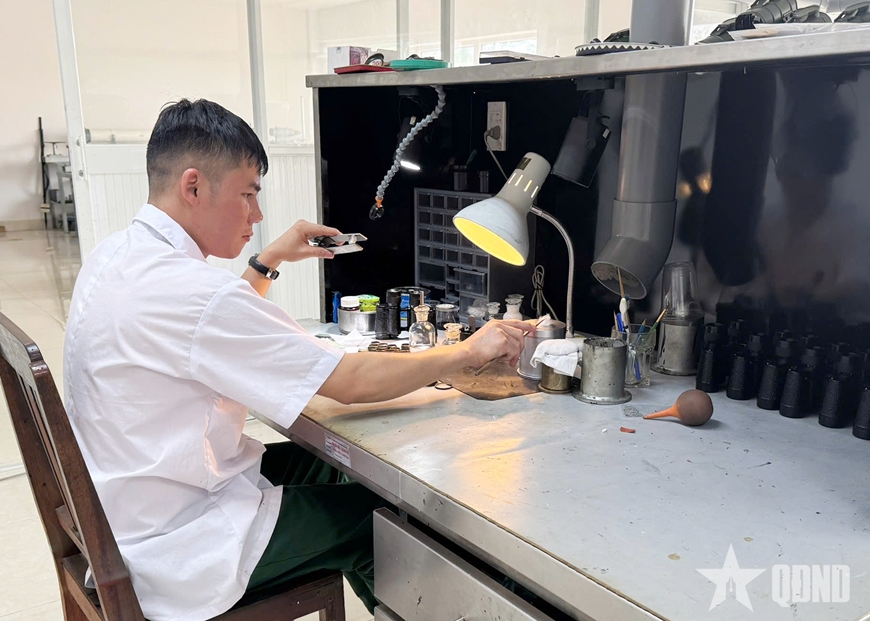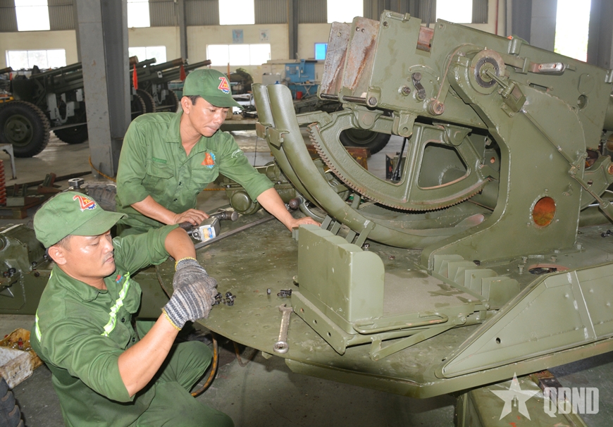 | Người thợ Xí nghiệp Sửa chữa Vũ khí miệt mài thử nghiệm, sửa chữa. |