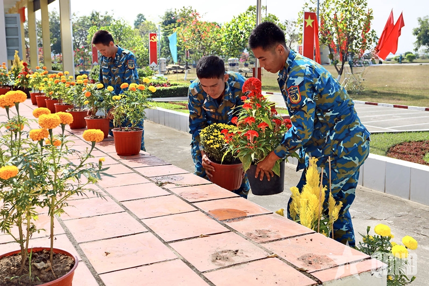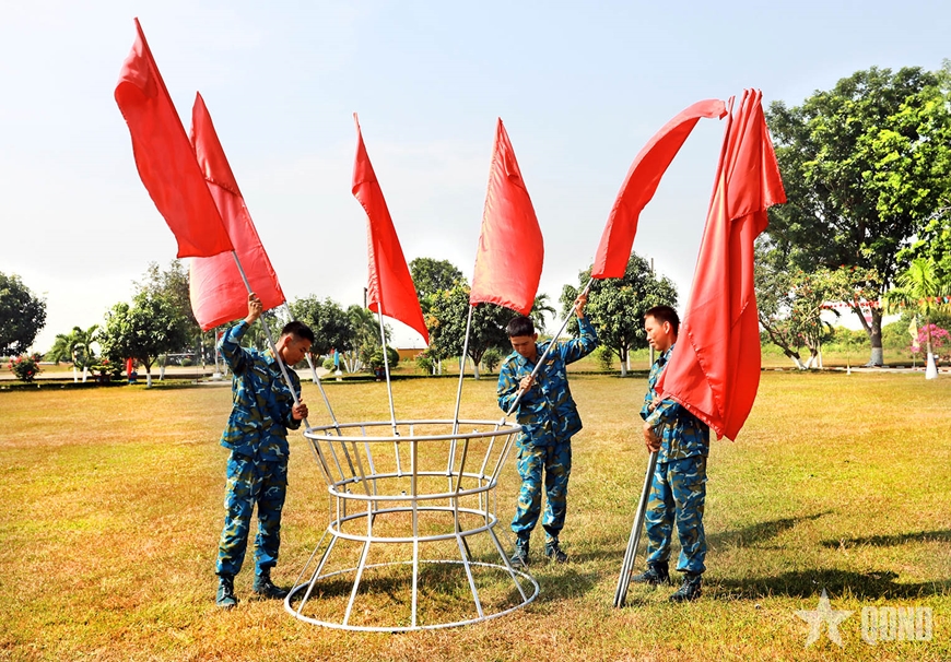Từ đằng xa, ánh nắng sớm mai chiếu rọi xuống khuôn viên đơn vị, nhuộm thắm những lá cờ đang được các chiến sĩ khéo léo cắm lên những chiếc cột đã được chuẩn bị sẵn. Bên cạnh đó, những chậu hoa rực rỡ sắc màu được mang ra xếp thành hàng ngay ngắn, không chỉ tô điểm cho doanh trại mà còn tạo nên một không khí thật tươi vui, khẩn trương, sẵn sàng chào đón một năm mới đầy thắng lợi.