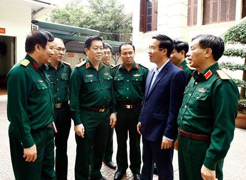 Đồng chí Võ Văn Thưởng và Trung tướng Nguyễn Trọng Nghĩa trò chuyện với cán bộ, phóng viên Báo Quân đội nhân dân. Ảnh: AN ĐĂNG.