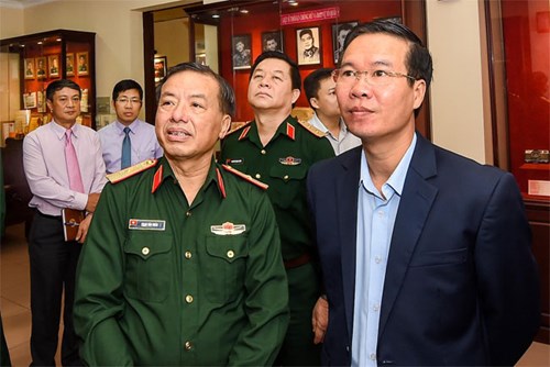 Đồng chí Võ Văn Thưởng và các đại biểu thăm Phòng Truyền thống Báo QĐND. Ảnh: TRỌNG HẢI