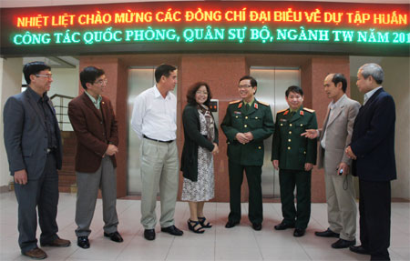 Lãnh đạo Cục DQTV và cán bộ chuyên trách, kiêm nhiệm công tác quốc phòng ở bộ, ngành trao đổi kinh nghiệm công tác quân sự, quốc phòng. Ảnh: Nguyễn Chính Hậu