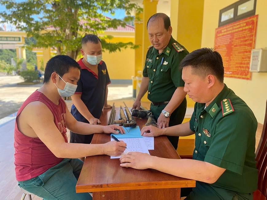 | Đại úy Lô Anh Tú (thứ nhất, bên phải) tiếp nhận vũ khí tự chế do người dân địa phương giao nộp. |