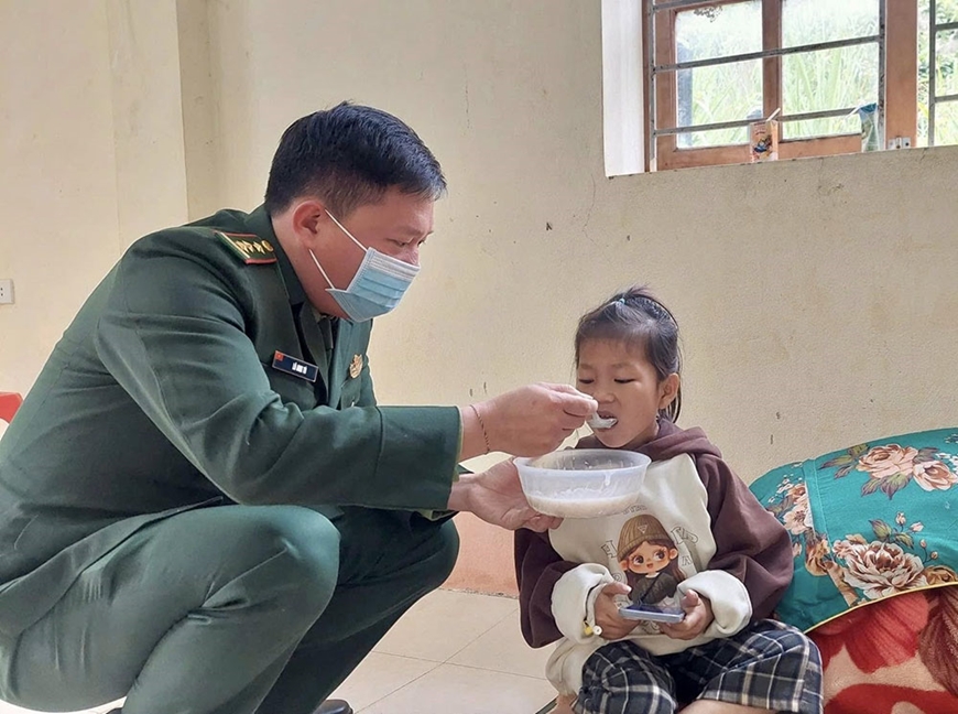 | Đại úy Lô Anh Tú chăm sóc trẻ em điều trị bệnh sởi tại khu điều trị dã chiến bản Phà Lõm. |