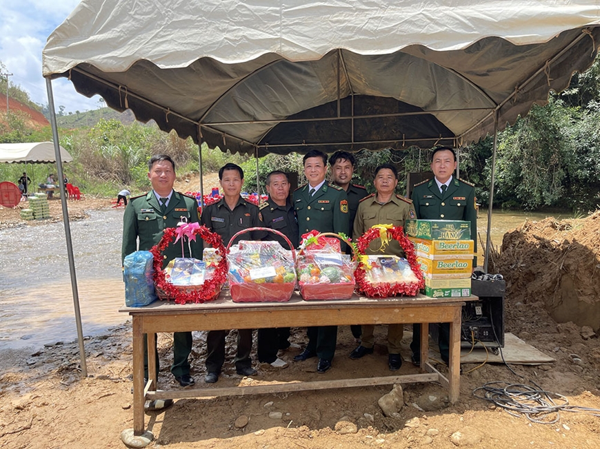 | Đại úy Lô Anh Tú (ngoài cùng, bên trái) tham gia cùng chỉ huy đơn vị tặng quà cho bạn Lào. |