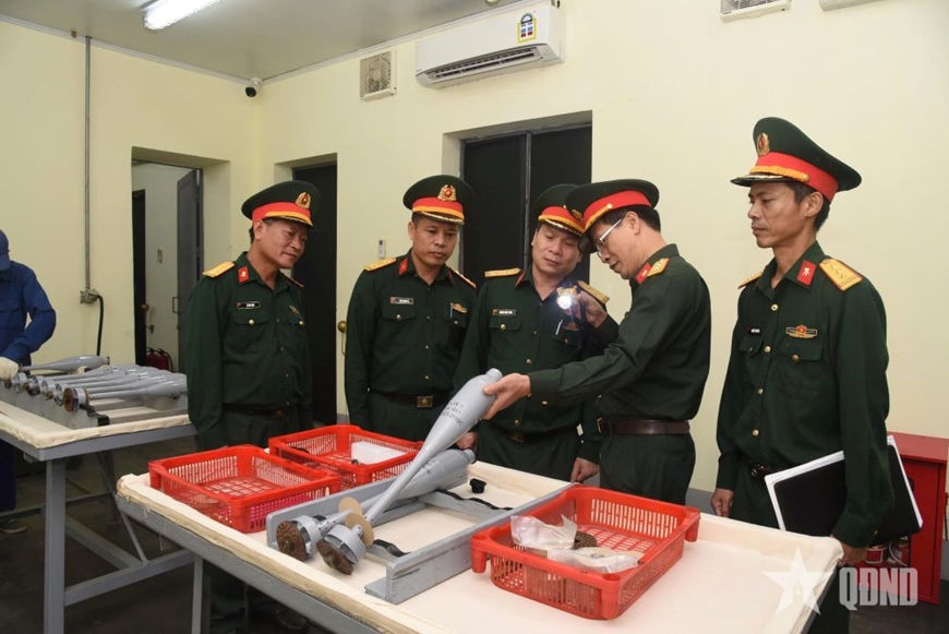 | Thượng tá Hà Đình Điệp, Phó cục trưởng Cục Quân khí (thứ hai, từ phải sang) kiểm tra sửa chữa đạn ĐKZ tại Xưởng X265. |